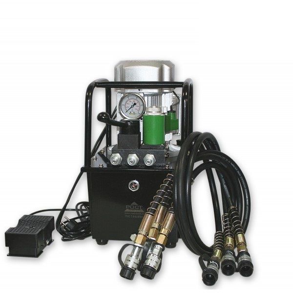 Гидравлическая насосная станция ГНС13-0,8П (220В) одностороннего действия (однопоточная) на три выхода с электроприводом предназначена для нагнетания гидравлической жидкости под давлением в гидроцилиндры рабочих инструментов одностороннего действия с пружинным или гравитационным возвратом штока. На станции установлен поворотный распределитель, который позволяет подключить три инструмента.